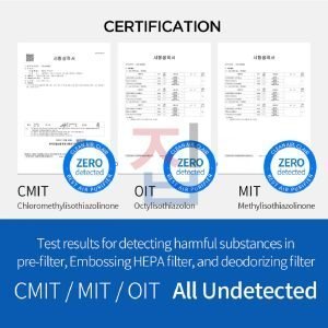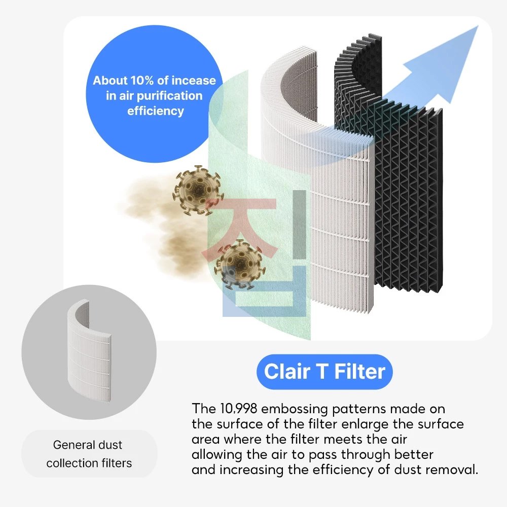 The Clair Korea premium HEPA air purifier is designed to deliver exceptional air purification with advanced filtration technologies and user-friendly features. At its core, the purifier employs a multi-stage filtration system to ensure clean, healthy air. The antivirus filter effectively captures large particles such as dust, mold, pollen, and pet hair while incorporating antibacterial properties to neutralize bacteria and viruses on the filter surface. Complementing this is the embossing HEPA filter, which enhances air purification efficiency, thanks to Clair’s electret charge technology and embossed surface processing.