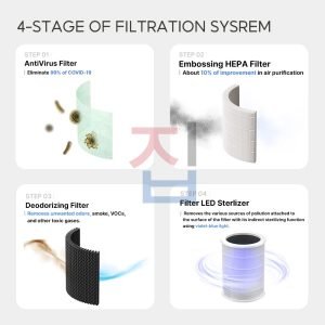 Filter: Prefilter, Clair embossed HEPA filter (CEPA), deodorizing filter, UV LED sterilization for virus removal >99%, 4 stages filtration system with dust removal >99% of 0.1 micron particles