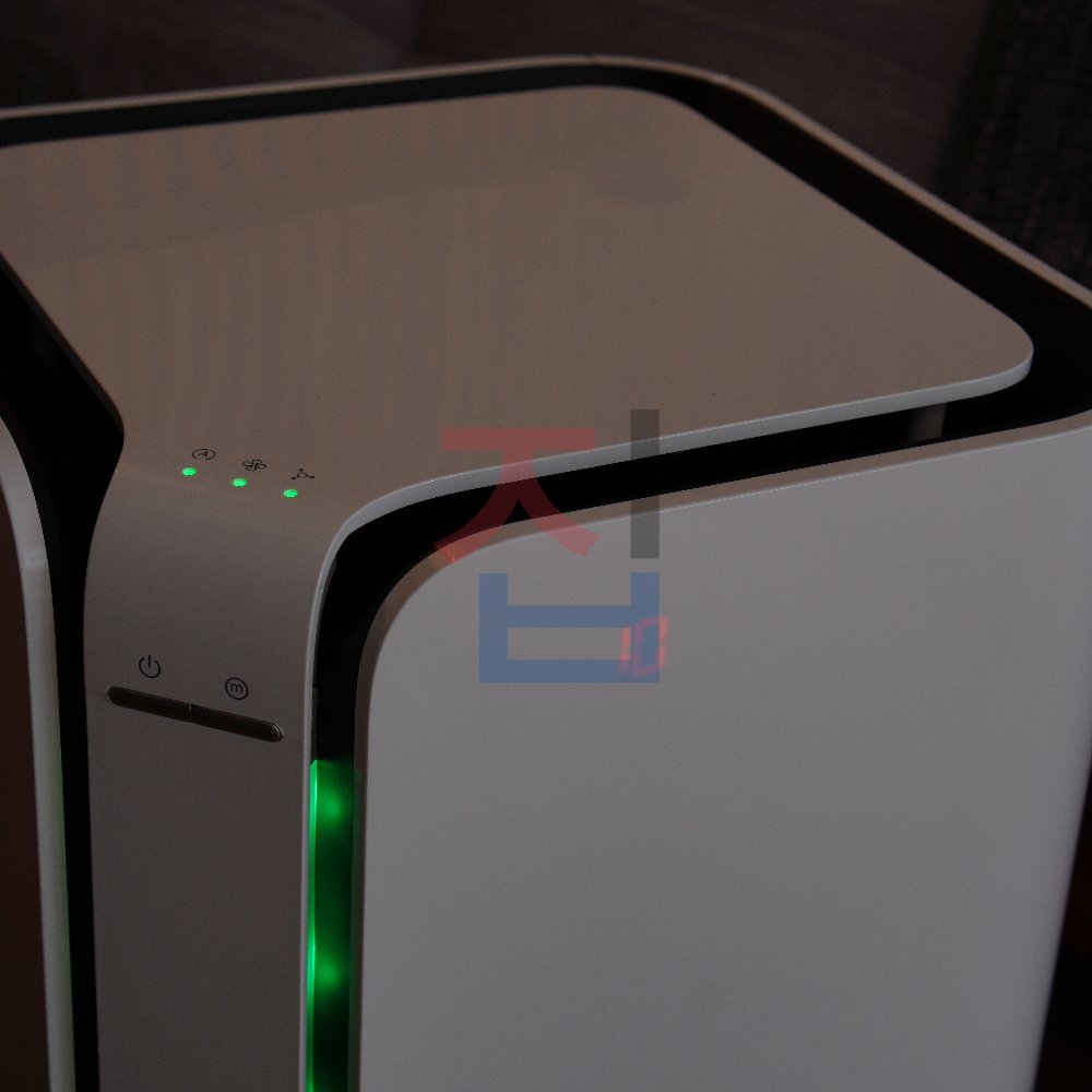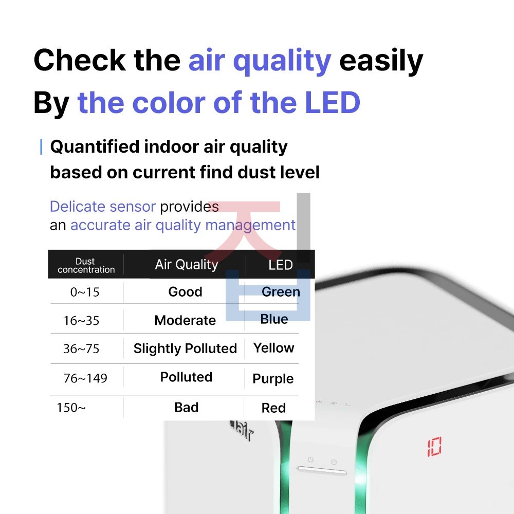 The air quality is constantly monitored with an LED air quality indicator, providing real-time feedback through a color-coded system: green for good, blue for moderate, yellow for slightly polluted, purple for polluted, and red for bad air quality.