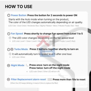 For tackling odors and harmful gases, the deodorizing filter removes unwanted smells, smoke, volatile organic compounds (VOCs), and other toxic pollutants. Additionally, the purifier features a filter LED sterilizer that uses safe Violet Blue Light to indirectly sterilize the filter surface, eliminating various pollutants without posing any harm to humans.